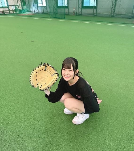 "野球と二刀流アイドル"越まりん、顔すっぽり収まりそうなキャッチャーミット構えニッコリスマイル!「可愛すぎか!」