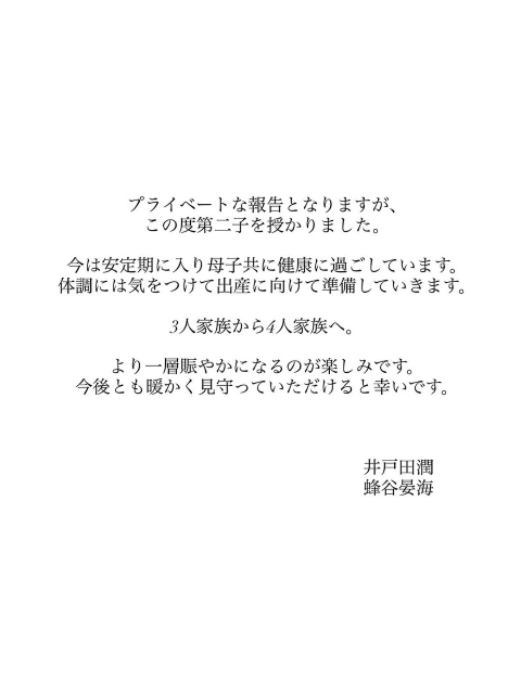 "スピードワゴン"井戸田潤の妻・蜂谷晏海、第二子妊娠をインスタでご報告!お祝いのコメント続々