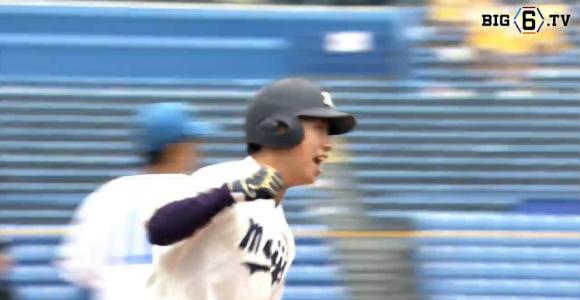 先制は明大。2回表、無死1,3塁のチャンスを作ると6番篠原(④報徳学園)がバックスクリーンに飛び込むスリーランホームランを放つ。