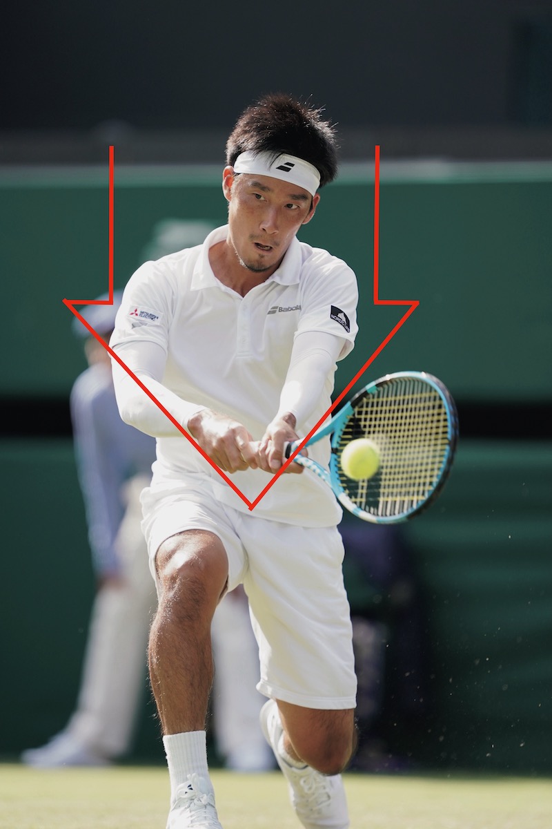 安定したショットのためには、無理のない腰の位置で打つことが大切。低いボールでは、上半身が突っ込みがちになるのでNGだ。そこで「ヒザを曲げて調整」し、腰の高さで打てるようにしてみよう。格段に打ちやすくなるはず!
