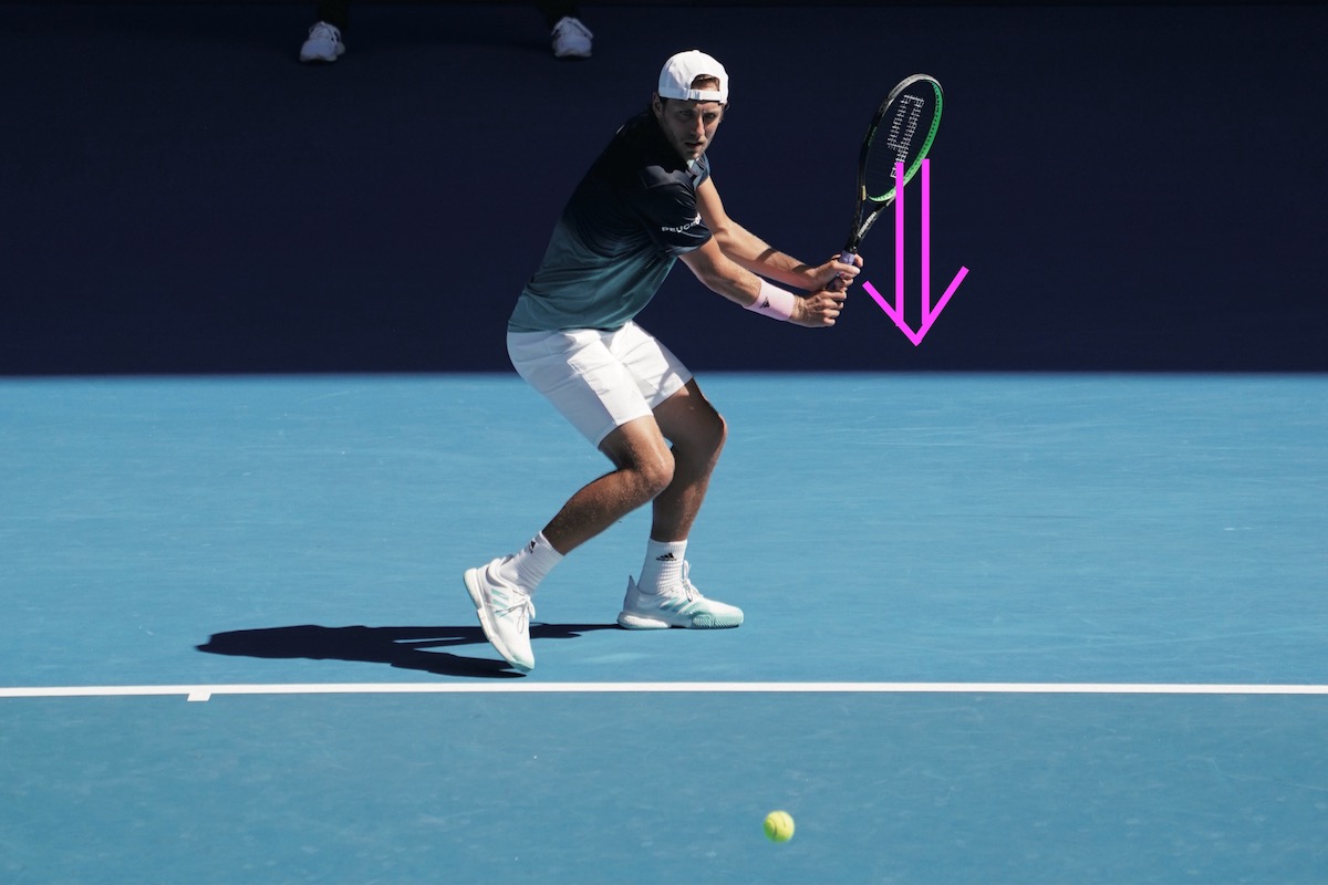 テイクバックからインパクトまで、ラケット面を不要に動かすと正確なインパクトが難しくなる。そこで「打球面を相手に見せるようにテイクバック」するのがポイント。不要な動きが抑えられて、インパクトの精度がアップするはずだ。