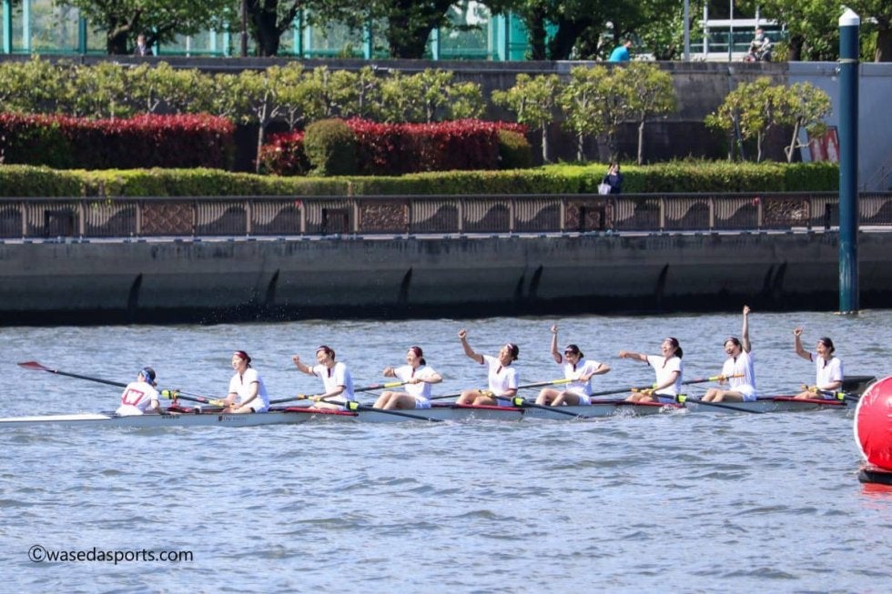 早慶レガッタで30連覇中の女子部。だが、今日を迎えるまでケガに悩まされメンバー変更も余儀なくされた。また前大会から距離が200メートル短縮され、800メートルのレースとなり緊迫した展開が予想されていた。それでも、「スタートダッシュから出ていく」(宇野聡恵主将、スポ4=大分・日田)と、出場したそれぞれの早大選手が息を合わせて漕ぎ進め、序盤から慶大とのリードを着実に広げることができた。5艇身差をつけ、見事31連覇を達成。早大女子部の総合力の高さを見せつけた。