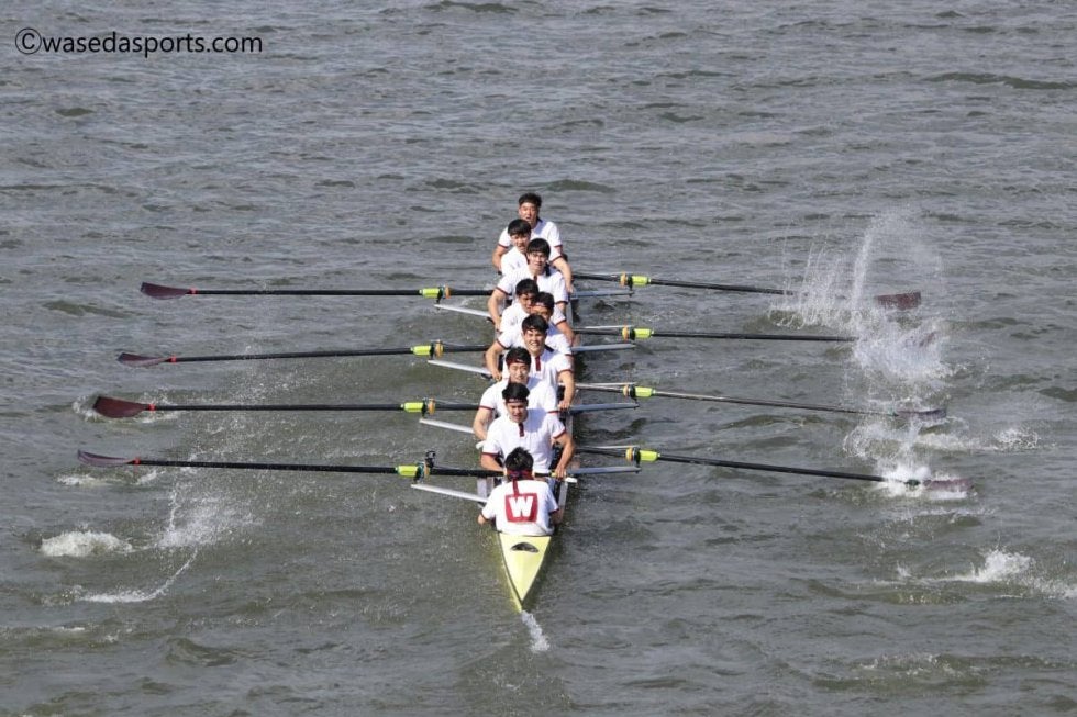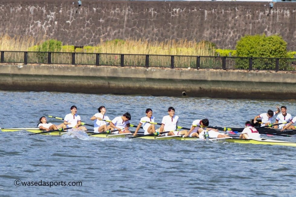 早大の4連覇がかかった対校エイト。両校順調なスタートとなったが、両国橋付近のカーブで慶大が見事なコーナリングを見せ2秒ほど先行される。巻き返したい早大であったが、荒波が影響し「オールをとられてしまうことが多かった」(川野柊、法4=東京・早大学院)と、慶大に動向を見られながらのレース展開に。それでも底力を発揮し、残り800メートルほどで早大は慶大と並ぶ。ここからは両者の意地のぶつかり合いとなった。ゴール直前の桜橋通過時点でも、勝者が全くわからない大接戦。ラストスパートで頭一つ慶大がリードし、わずか4分の1艇身、秒数にして0・9秒、早大は勝利に届かなかった。