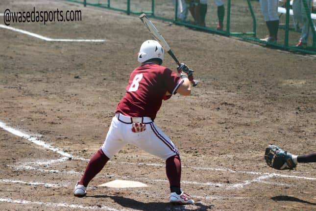 対する打線は初回から打者一巡の猛攻を見せる。慶大の先発・田中の制球が定まらないなか、先頭打者の鈴木涼介(スポ3=福島・安積黎明)がいきなりバント安打で出塁する。2番・尾松の安打で早速1点を奪うと、続く白石、澤優輝主将(人4=東京・国学院久我山)も連続で出塁し、無死満塁のチャンスをつくることに成功する。続く5番・安孫子徹(スポ3=東京・昭和)はフルカウントまで粘った末に空振り三振に倒れたものの、6番・竹村侑大(スポ4=埼玉・早大本庄)の右翼手への当たりが、相手の守備の乱れも絡んだことにより、走者一掃の3点適時打となり、点差を一気に4-0まで広げた。その後7番・畠山陸(スポ1=高知西)、9番・西村悠太郎副将(スポ4=福岡・筑紫丘)も適時打を放ち、早大打線はこの回だけで一挙6点を奪った。ピッチャーが蛭田淑仁に変わった3回にも8番・駒谷理央(国教3=米・バッファローグローブ高)や代打・齋藤向陽(社1=群馬・新島学園)の安打で3点を追加し、計11得点を奪い慶大を圧倒した。