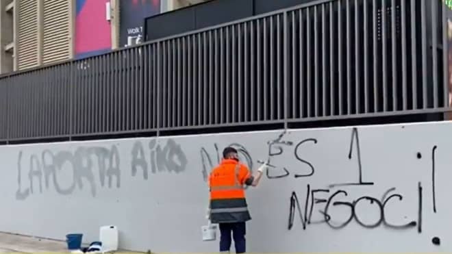 カンプノウの外に書かれたラポルタとスーパーリーグに反対する落書きが話題 | サッカー