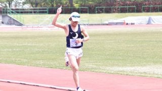 <写真・手を突き上げフィニッシュした守屋> 4月22日、ヤンマーフィールド長居付設長距離競走路にて第98回関西学生陸上競…