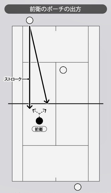 雁行陣どうしの展開で後衛どうしがストロークラリーを行っている間、前衛はそれぞれ斜め前後に動く