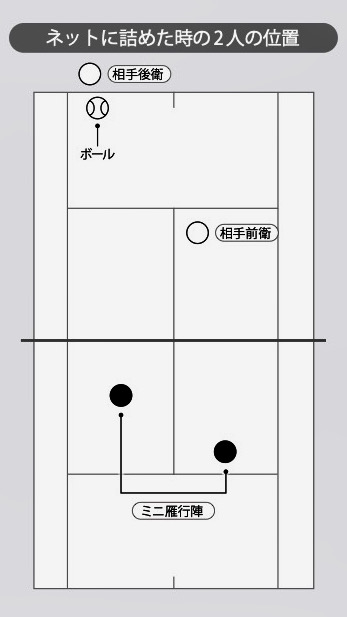 浅いボールを打ってネットに詰めた時、2人はミニ雁行陣を作る。相手後衛にボールがある時、そのボールから遠い位置に1人、近い位置に1人の配置になる