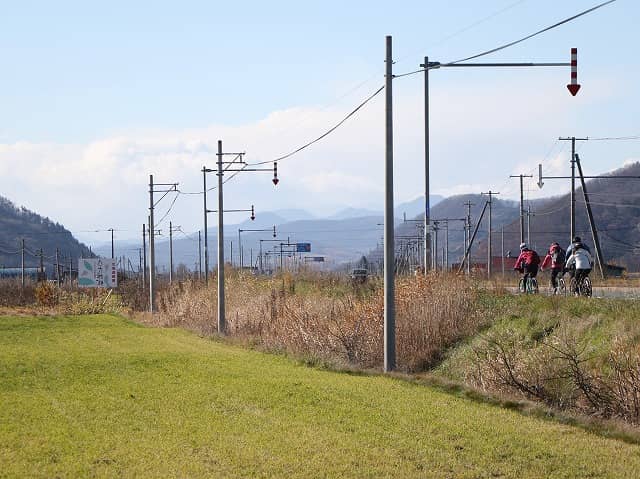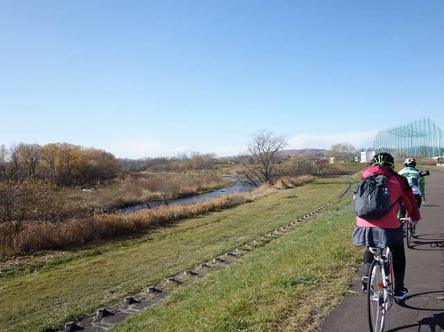 ここからは本格的なライドが始まる。自動車が来ない無加川の堤防上を行くことになった。冬景色ではあるが、草地も多く、緑色が濃いため、春のような華やぎもある景観が広がる。川沿いとはいえ、ほぼ川のありかは分からないほど、広大な空間が広がっている。河川敷は運動場になっていたり、市民のために活用されているようだ。
