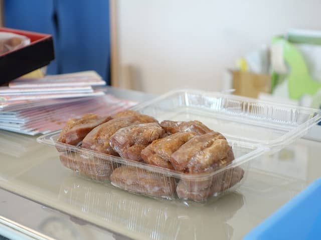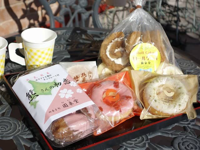 糖衣にハッカを加え、小ぶりで食べやすくした「子熊のおやつ」や、ホワイトとイチゴチョコがかかった「熊さんの初恋(季節限定)」など、アレンジバージョンもあるのだが、まったく違うお菓子のよう。お椀型のモナカや、外側に羊羹がかけられたモナカ「黒ゆり」など、和菓子もオリジナリティーに溢れており、焼きドーナッツのような洋菓子もおいしい! 自転車で着いた我々を応援してくださり、店舗のスタッフの方がコーヒーを入れてくれた。皆が本当に温かい。そして、またもや買いすぎ、食べすぎて、予定が押していくのだった。