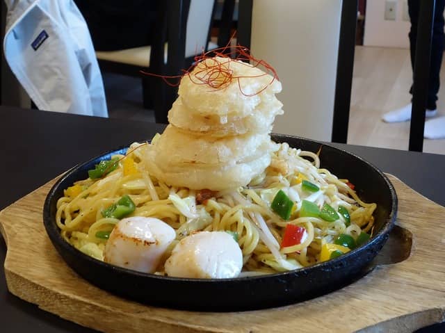 名産の玉ねぎの天ぷらが高く積み上げられ、立体的に視覚にもアピールしてくる塩焼きそば。分厚いホタテも入っていて、焼きそば自体も高級料理の域!