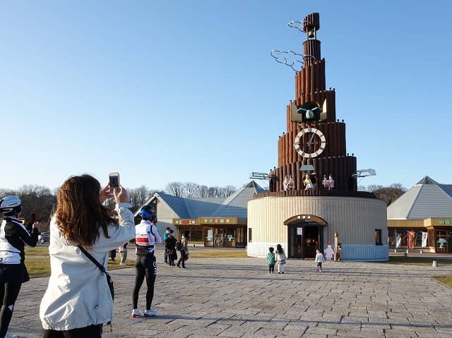 道の駅に到着すると、ちょうど時計の長針が「12」を指し、ハト時計が動き始めるところだった。大急ぎで自転車を置き、時計の前に走る。