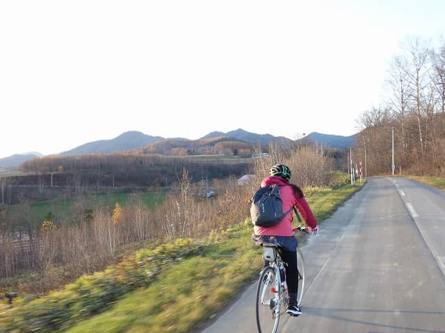 道路脇には畑が広がり、その奥には山々が連なる。幹線道路ではあるが、景観も楽しめる。このあたりは玉ねぎ畑が多く、収穫期は香りでいっぱいになる。路面も走りやすく、強い向かい風以外は爽快だ!