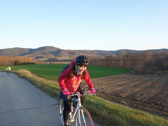 ここからは少しヒルクライム。道の駅の裏手を上っていく。田園風景を抜け、しばらく行くと視界が開けてくる。思わず歓声があがった。山々と田園風景と集落と__。傾き、色を変えたやわらかい陽の光に照らされた景観は、えも言われぬ美しさ。思わず見とれてしまう。