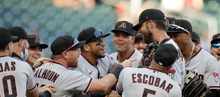 7イニング制では初の“ノーヒットノーラン”を達成し、ナインに囲まれるダイヤモンドバックスのマディソン・バムガーナー【写真:AP】