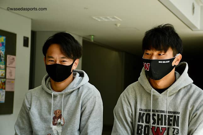 DBとマッチアップし、華麗なキャッチで試合の流れを呼び寄せるWR。ここ数年のBIG BEARSは、洗練されたパスプレーを武器にTDを量産してきた。今年のWR陣はどのようなプレーを見せてくれるのか。今回はWR田口凛太郎(創理4=東京・早大学院)とWR田窪大渡(政経4=東京・早大学院)にお話を伺った。