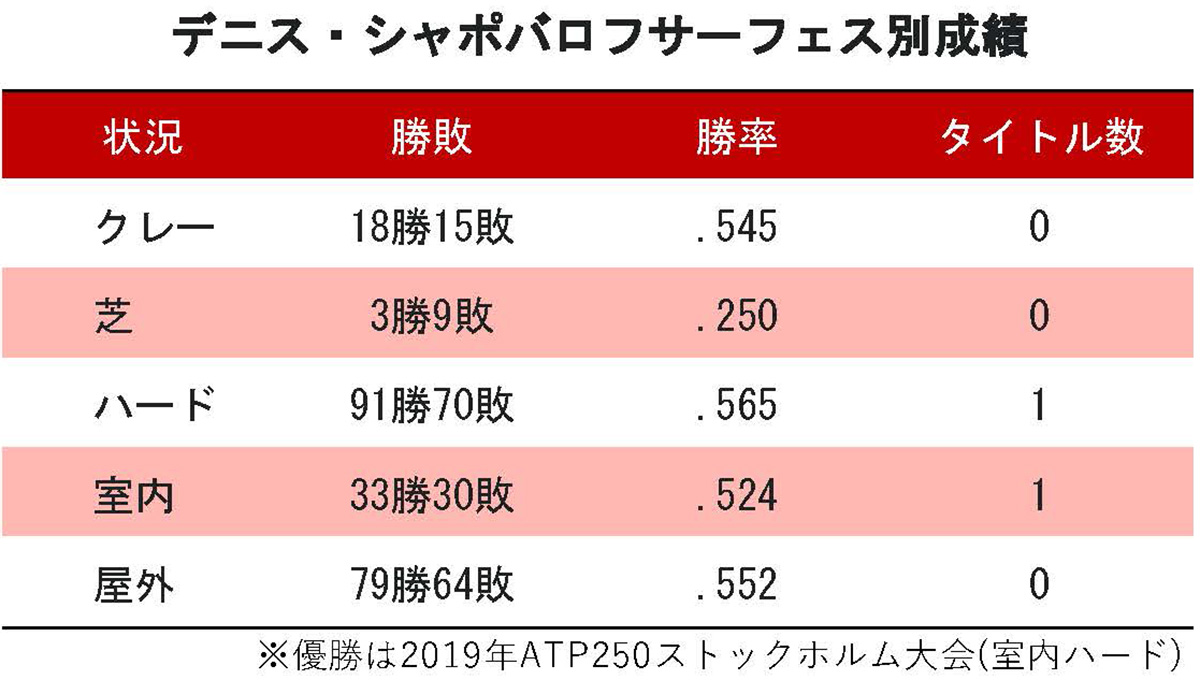ちなみに、サーフェス別の通算勝率を見てみると、1位ハードコート56.5%、2位クレー54.5%、3位芝25.0%。ゲーム数の差はあれど、勝敗的にはそれほど大きな差はないようだ。