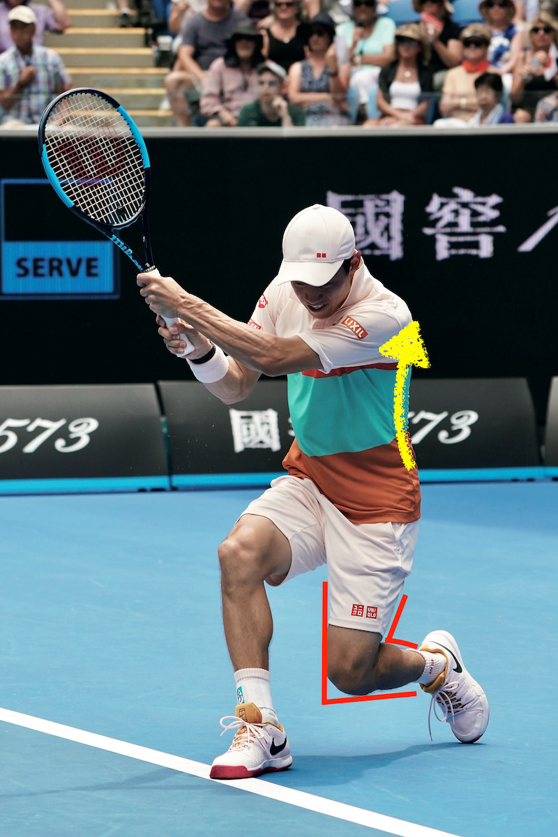 後ろヒザの曲げ&上体反らしをすることで、打点が腰に近くなり打ちやすくなる (写真:錦織 圭[日清食品])