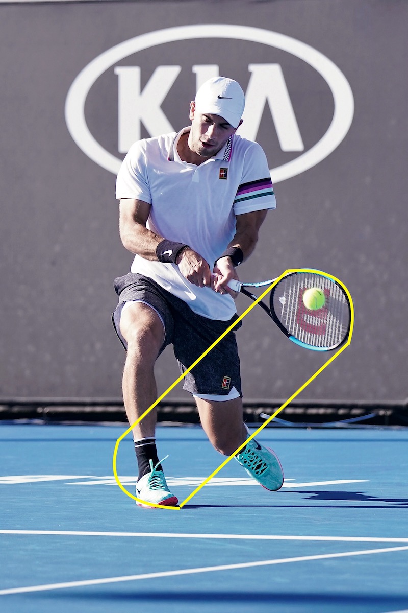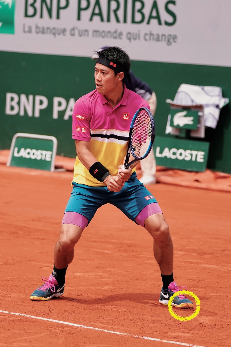 軸足のつま先を基点にすると、飛んできたボールの距離感を合わせやすい! (写真:錦織 圭[日清食品])