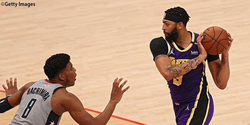 この日の八村塁は約30分の出場で12得点1リバウンド2アシスト1スティールをマーク。レイカーズのアンソニー・デイビスとマッチアップし、ターンオーバーを誘発させるなどディフェンスを中心に活躍した。オフェンス面では第3クォーター残り8分54秒に、速攻でブラッドリー・ビールからパスを受け取ると、そのままデイビスのブロックの上からポスターダンクを披露した。