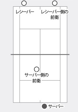 サーバーはセンター寄りに構え、前衛はセンターライン付近に低く構える