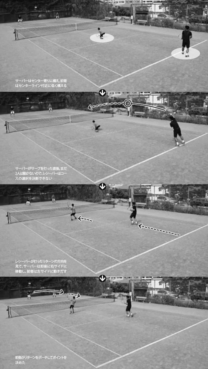 レシーバーが打ったリターンの方向を見て、サーバーは即座に右サイドに移動し、前衛は左サイドに動き出す