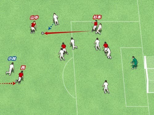 左で山中がボールを受けたシーン。中央にいた西は、このあとどうしただろうか