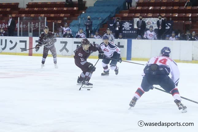 決勝リーグ1回戦の相手は強豪の中大。第1ピリオド(P)では、両者得点を許さず0-0で終えたが、試合が動き出したのは第2…