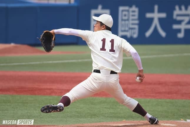 東京都に緊急事態宣言が発令された影響で、前週より無観客での開催となっている東京六大学春季リーグ戦(リーグ戦)。スタンドにいた応援団の声援もなく、静寂に包まれながら試合を行う異例の状況が続いている。立大戦で連敗を喫しこれ以上勝ち点を落とせない早大にとって、今カードは絶対に負けられない。そんな早大の先発は今季不調が続く1。第一先発としての責任を果たすべく、法大・三浦銀二主将(4年)とのエース対決に臨んだ。試合は5回までお互い得点を許さない展開が続き、両先発の実力にふさわしい投手戦となった。