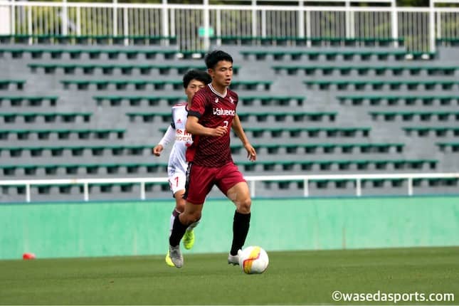 試合は開始早々に動いた。1分、流通経大のスルーパスが長くなったことを見てゴールキックへと逃れようと早大DFが体を入れるも、サンフレッチェ広島への加入が内定しているFW満田誠(4年)がうまく入れ替わりボールを奪取。最後はMF佐藤響(4年)がゴールに流し込み、早大は難敵を相手に先制点を与えてしまう。その後も試合は流通経大ペース。9分にはまたしても満田の個人技で早大左サイドを突破されシュートまで持ち込まれる。しかしGK公文翔(スポ4=東農大一)が体を張ってゴールマウスを死守。23分にもロングボールから決定機を許すも、シュートは枠外に逸れ、追加点は与えない。