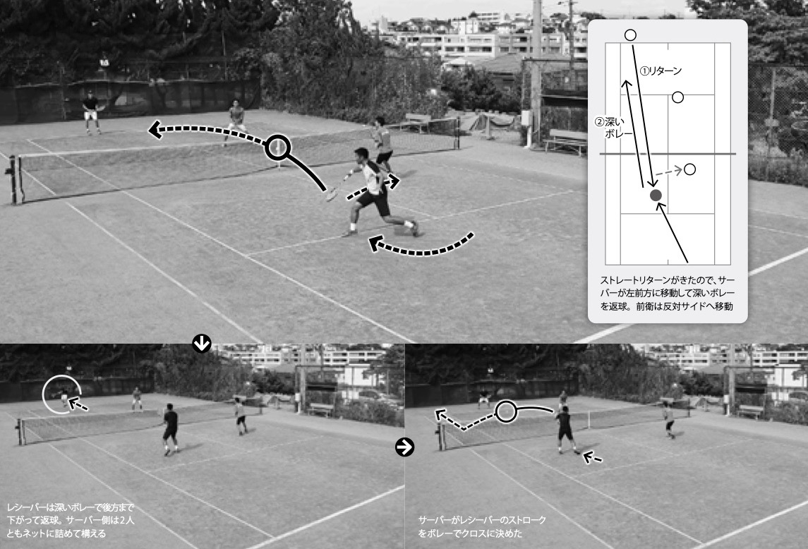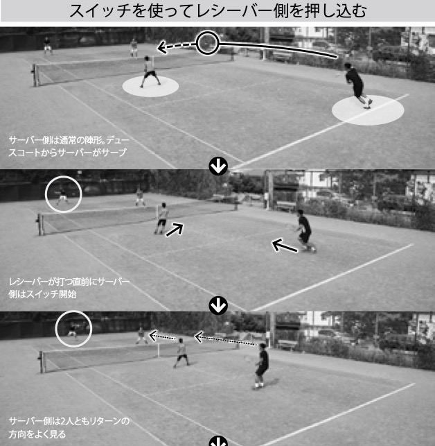 それがスイッチです。サーバー側はサーブを打ったら、2人とも反対側のサイドに移動します。もしレシーバーがクロスリターンを打てば前衛がポーチに出て、もしストレートリターンならサーバーがファーストボレーで対応するのです。