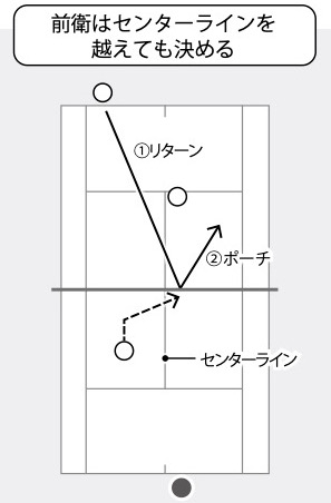 前衛がセンターラインを越えてポーチ。2人で事前に打ち合わせをしておけば、前衛はこのように思い切り動くことができる