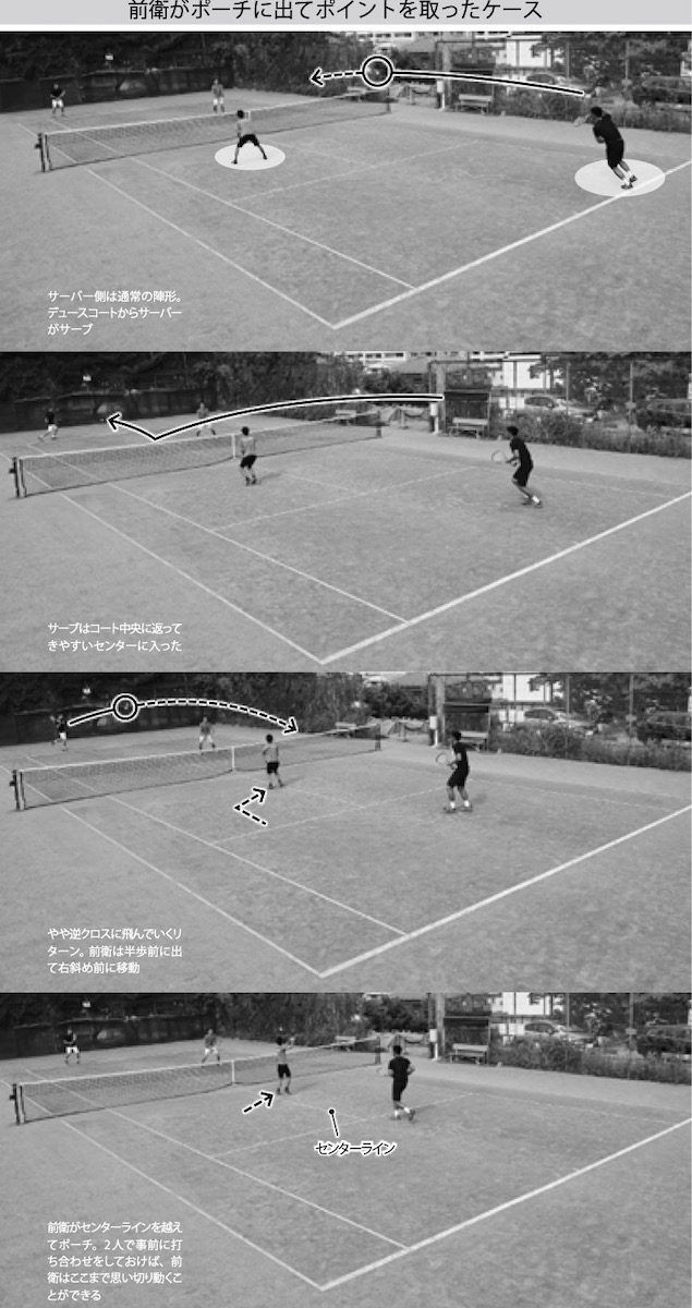前衛がポーチに出ると事前に打ち合わせした場合、前衛は中途半端な動きをしないことだ。センターラインを越えてでもポーチを決める強い気持ちを持とう