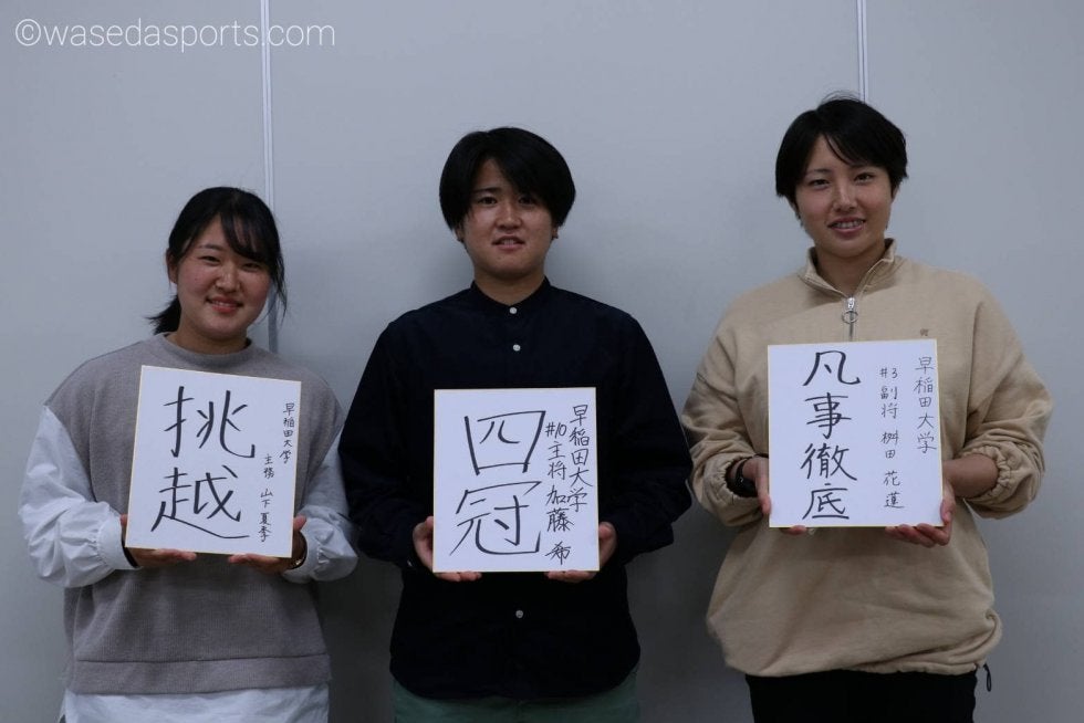 山下 最初はいつも通り『頂』にしようと思っていたんですが、(タイトルをかけた一戦で)負けてるし、ちょっとあまり良くないのではないかという話になっていました。私と千夏(並木千夏、スポ4=静岡・藤枝順心)が『挑越』にこだわった2人なんですが、監督が練習中に手をたたきながらいろいろ叫ぶときに「挑むんでしょ!」「越えるんでしょ!」というのが一番想像つくよね、というのをまず千夏がフィーリングで言ったのが最初で。今年は昨年の結果もあったし、挑戦者という気持ちは忘れたくないよねということで、『挑越』に決まりました。