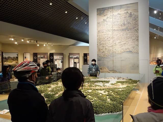 参加者は全員検温と体調チェックを受け、レンタサイクルの方はフィッティングを済ませ、名護屋城博物館へ。まずは、名護屋城とこの地域の歴史について、学芸員の松浦さんに基本的な話を伺う。