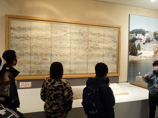 屏風絵と現代の様子を比べながら、美しい景観に見入る参加者たち