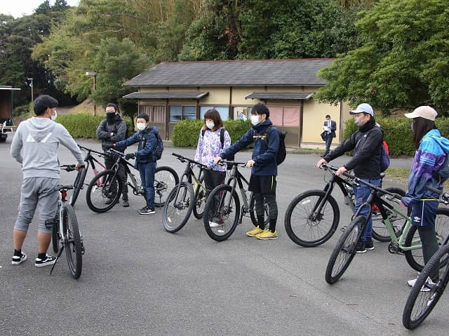 記念撮影を経て、グループごとに分かれ、自転車の操作法の確認や、空気圧、ブレーキの安全点検を経て出発。