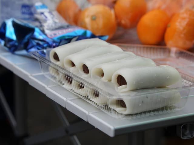 ゴールした参加者全員に、屏風絵が描かれたうちわと、武将たちのキャラクターが描かれたクリアファイルが配られ、地元のお菓子「けえらん」が差し入れされた。この「けえらん」は蒸したうるち米で作った生地で、丁寧に炊いたあんを巻いたシンプルな和菓子。太閤秀吉が必勝祈願で神社を訪れた際に、地元の人々が戦勝祈願に献上すると「これを食べたら、勝つまで帰らん(けえらん)」と語ったことから、この名が付いた。唐津市の和菓子店が、この当時の手法を今も守り、同じ味を提供し続けている。少し噛みごたえのある、もちもちとした生地に、気持ちのいい甘さのあんが巻かれていて、ゴール後の身体にしみる美味しさだ。