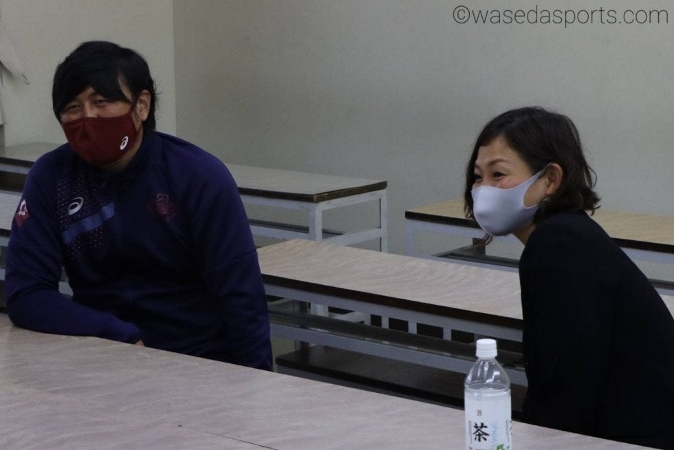 初対談となった外池ア式蹴球部監督(左)と福田ア式蹴球部女子部監督