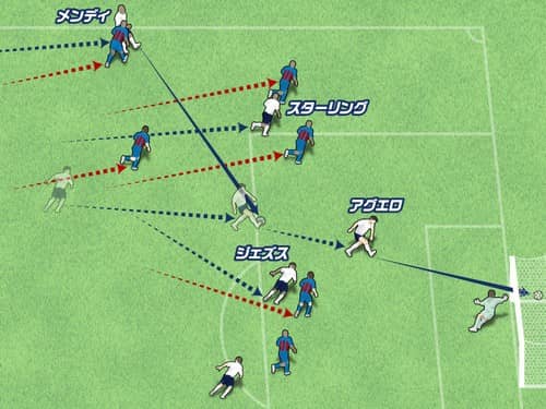 その瞬間に、近くのラヒーム・スターリングは縦のスペースへ走り出し、最前線のガブリエル・ジェズスはペナルティーエリア中央へ動いた。