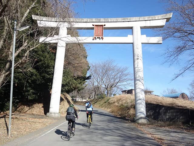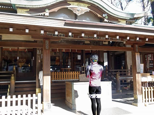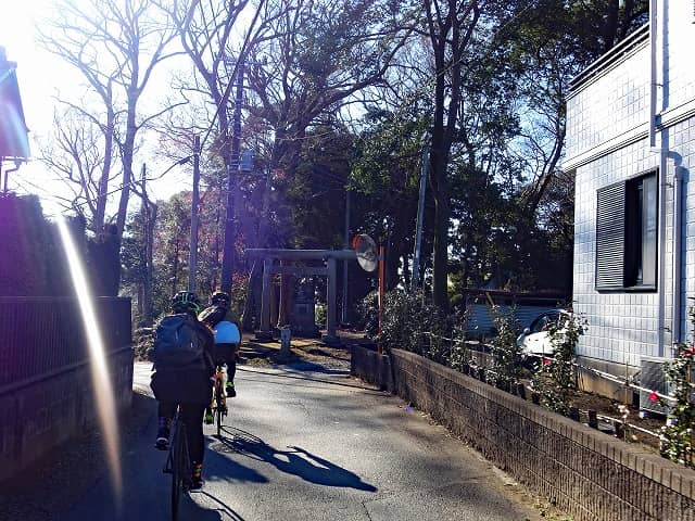 大きな鳥居の下を自転車に乗ったままくぐり、神社へ向かう