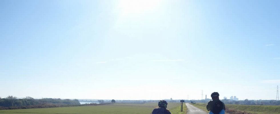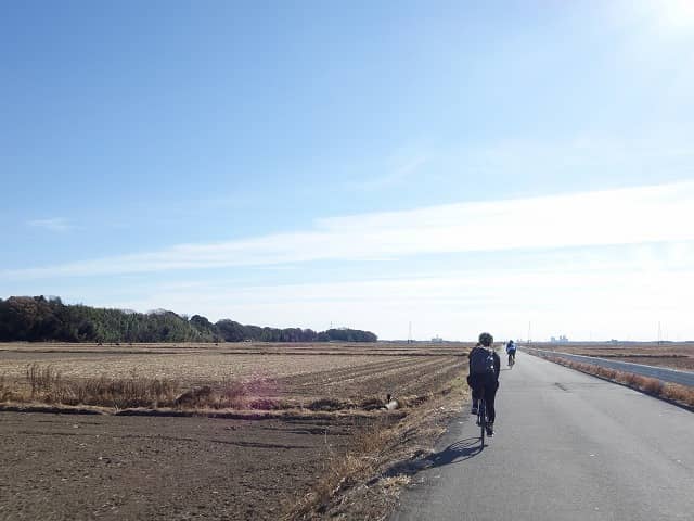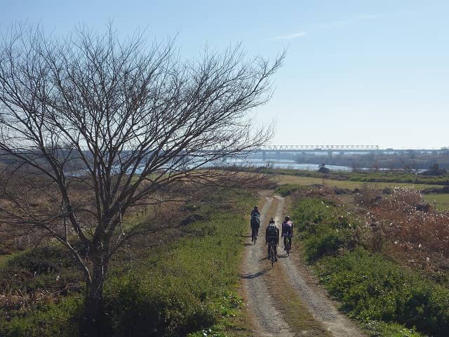 鬼怒川沿いには、葉を落としてしまった木々はあれど、鮮やかな緑色の草に覆われており、春のような華やいだ景観が広がっていた。広がる眺めは雄大で、空が広い。車も来ず、まるで貸し切りのような開放感! 都心からこの距離で、これだけの環境を走れるのは魅力だ。ぼんやりと、前方に太陽の陽に輝く水が見えてきた。あれが合流地点か? ワクワクしていると、舗装道路が終わり、オフロードへ突入。今回は全員ロードバイクで来ており、自分のライディングテクニックにまったく自信のない筆者は、ガタガタする砂利道の上を走るのは、ヒヤヒヤだった。今にも転んでしまいそう。タイヤの太いクロスバイクだったら安心なのだが……。まごまごしていると「草の上の方が走りやすいですよ!」とアドバイスが飛んできた。なるほど! 砂利の少ないエリアを選びながら、バイクを進めていく。