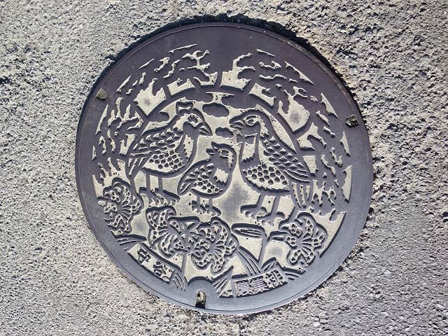 守谷のマンホールには市の鳥「小綬鶏(コジュケイ)」と市の花「ヤマユリ」が描かれていた