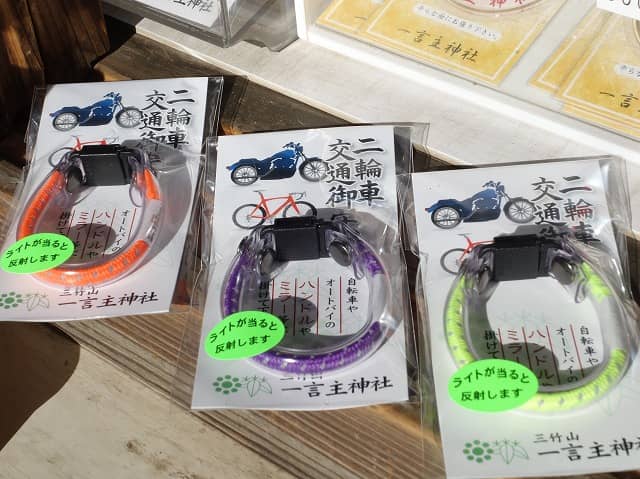 お参りをし、お守りを見にいくと、なんと自転車にぴったりの二輪車お守りがあるではないか。ハンドルやミラーなど、車体につけるようだ。ビビッドな色のものは、反射材が使われており、走行中に光ることで、実際の役割としてもライダーを守ってくれる。それぞれが好みの色味を選んで購入し、ハンドル周りに装着した。