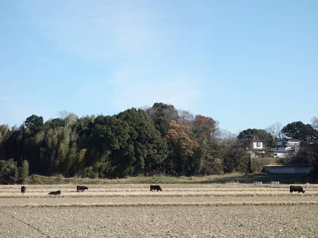 広大な田園風景の中を抜けていくと、放牧中の牛たちが草を食んでいた。この自由さに驚く一同。2021年は丑年とあって、記念撮影を試みるメンバーもいたが、距離があり、牛と一緒に撮影するのは難しそうだった。地域の景観を楽しみながら、バイクをさらに走らせる。
