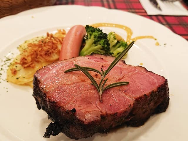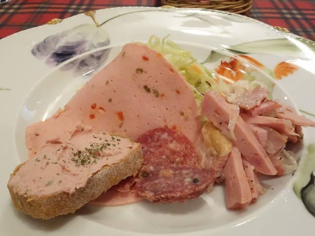 ほどなく、スープと前菜が運ばれてきた。ザワークラウトとともに盛られた一品一品の上質なこと! レバーペーストも、まったく臭みがなく、旨味がたっぷりだ。これはメインも相当期待できるに違いない。はやる心を抑えきれない一同。良い香りとともに、メインデッシュが運ばれてきた。歓声が沸き上がる。