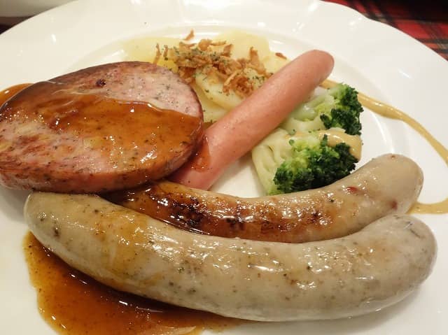 メインディッシュが登場! ボイル、焼きソーセージと、輪切りにし、焼きつけた太ソーセージが盛り合わせされている
