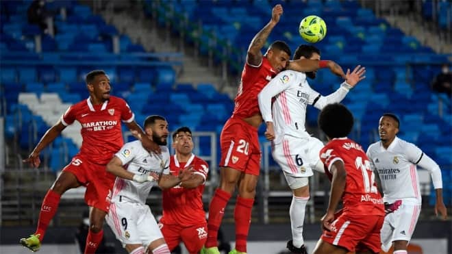 ジュレン・ロペテギ監督を累積警告で欠くセビージャが積極的な入りを見せたが、先にネットを揺らしたのはホームチーム。11分、ヴィニシウス・ジュニオールから右サイドでパスを受けたアルバロ・オドリオソラのクロスをファーサイドに逃げながらカリム・ベンゼマがヘッドで流し込んだ。しかし、オドリオソラの右足がラインを越えていたとしてオフサイドに。