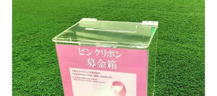 マリーンズカスタマーセンターに設置されたピンクリボン募金箱。集まった募金は「愛基金」を通じて、認定NPO法人J・POSH「ピンクリボン基金」へ全額寄付され、乳がんの撲滅、検診の早期受診活動、乳がん体験者と家族の支援へ役立てられるという。