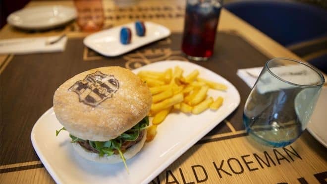 バルサが優勝した5つのチャンピオンズリーグの決勝戦で着用したユニフォームに囲まれながら、バルサのエンブレムが泡にプリントされたビールや、バンズにエンブレムがプリントされたハンバーガー、バルサマカロンなどを楽しめる。